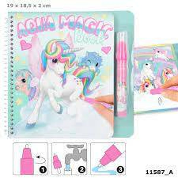 Magisch malen. Im Aqua Magic Book von Ylvi erscheinen wie durch Zauberei wunderschöne Motive, wenn man mit dem Wasser-Stift (befüllbar) über die weißen Seiten streicht. Ist das Papier später getrocknet, verschwinden die Bilder wieder. Die fünf spiralgebundenen Seiten sind aus sehr festem Karton, sodass sie nicht durchweichen.